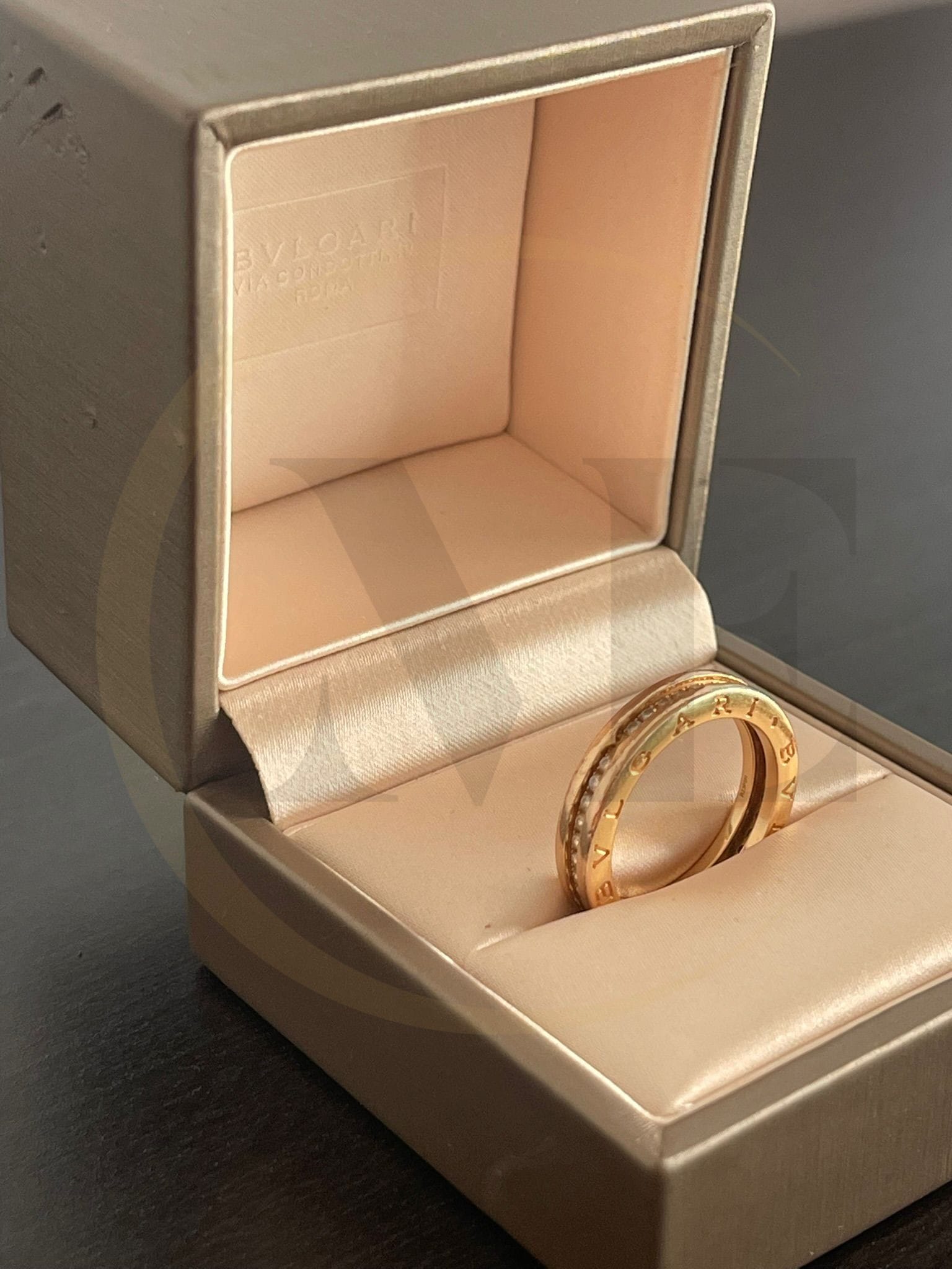 A assinatura gravada “BVLGARI BVLGARI” nas extremidades reforça a identidade forte e atemporal da marca, enquanto a construção em múltiplas bandas confere volume, presença e personalidade à peça.